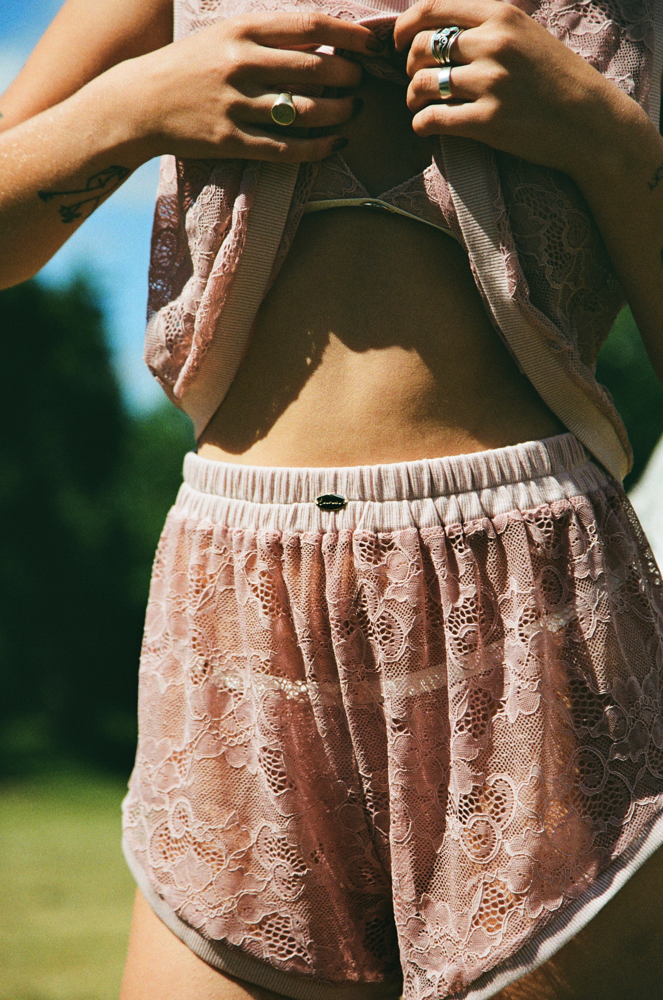 The lace shorts feature a flattering, comfortable fit that moves with you, while the sheer, flowy top drapes delicately over the body in an oversized fit. Subtle ribbed detailing adds a hint of sporty charm, making the set as versatile as it is beautiful.