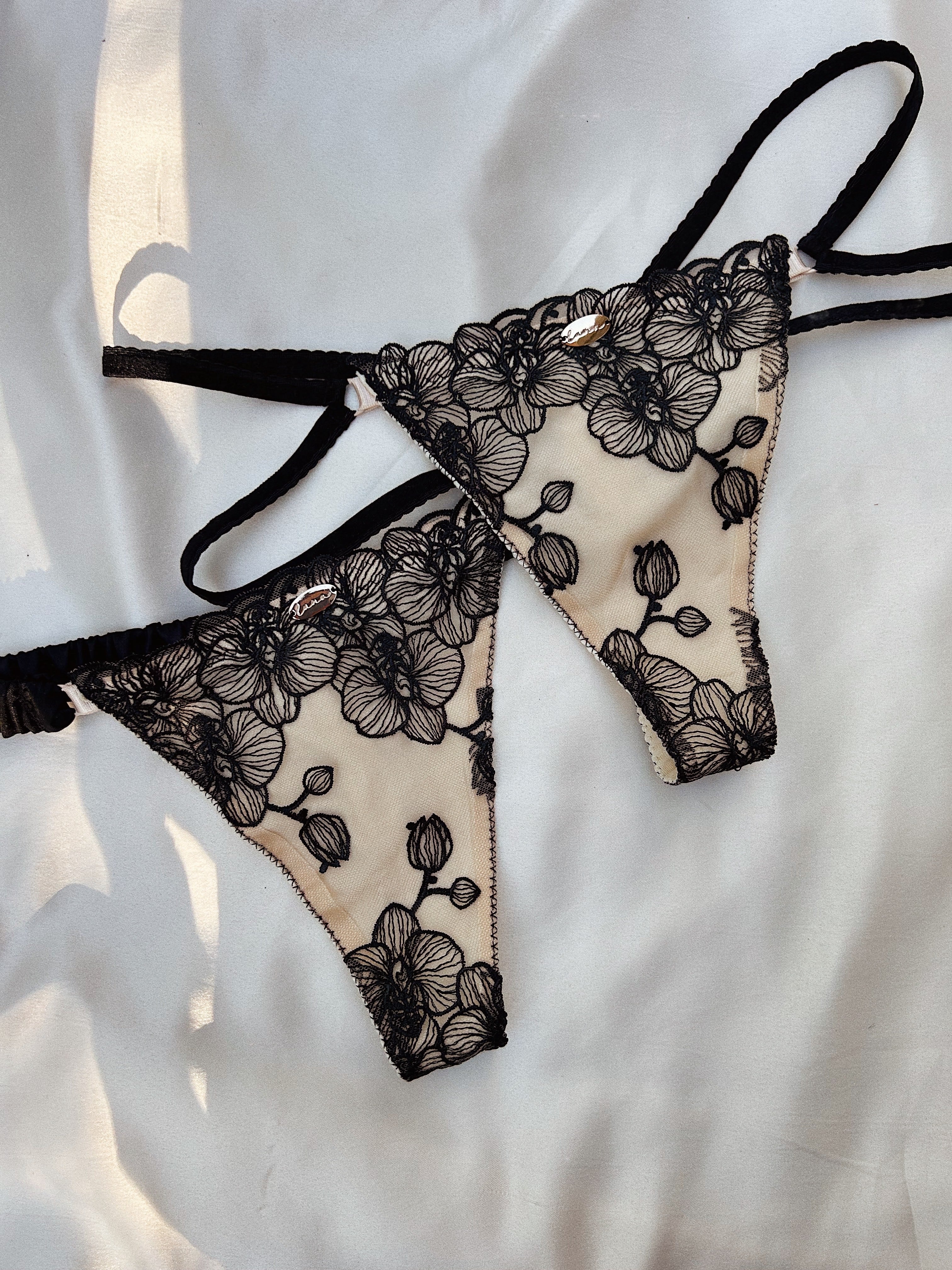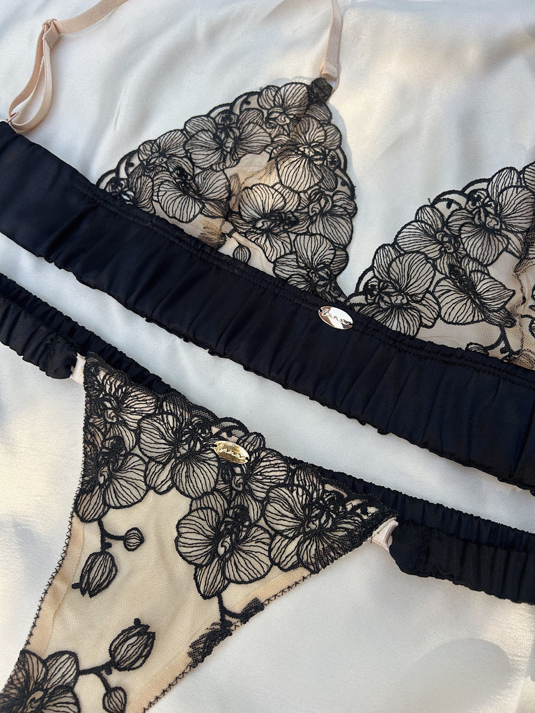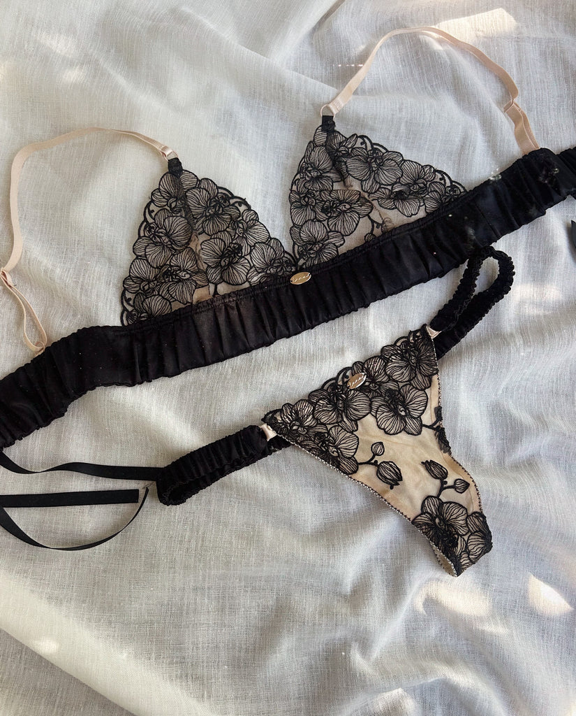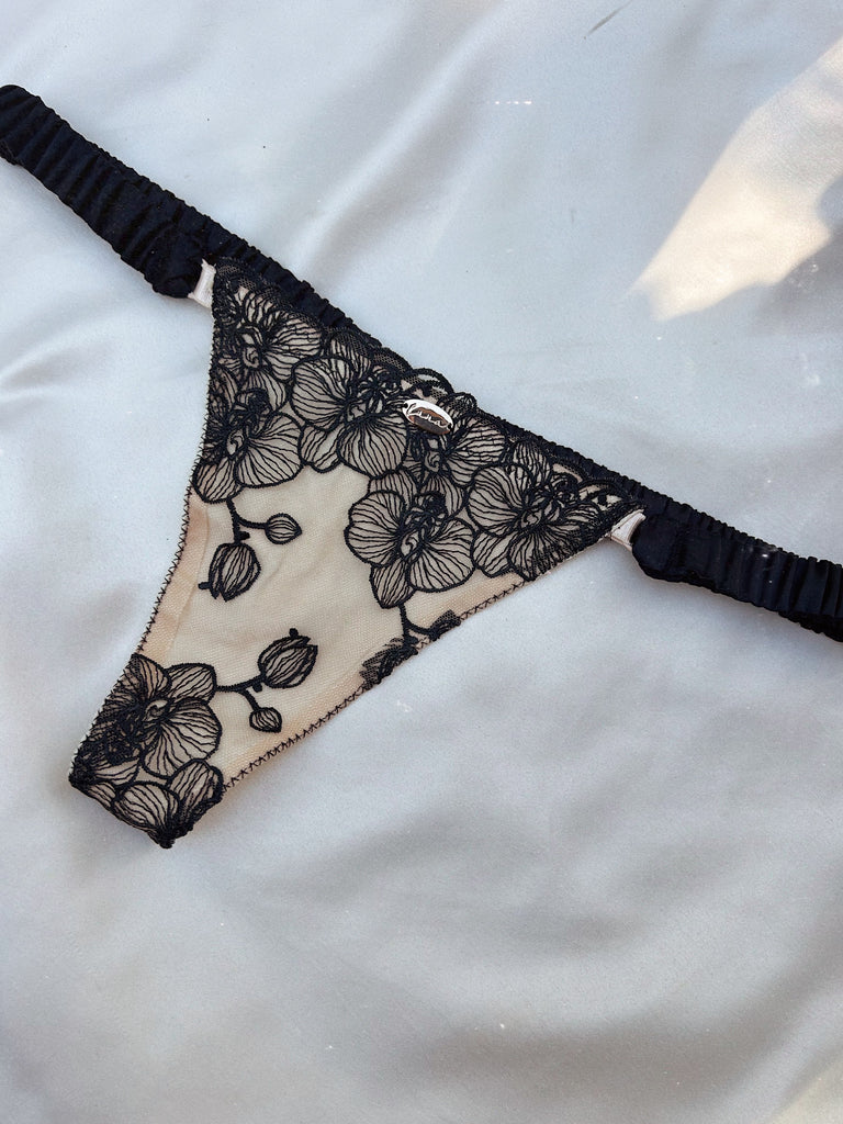Delicate, striking, and endlessly feminine, the Thalia Knickers capture the perfect balance of softness and allure. Crafted from creamy stretch lace embroidered with dark orchids, they mirror the beauty of the matching bralette. Choose your preferred style: double straps for a modern, sultry look, or a soft ruched satin band for a touch of indulgent luxury.