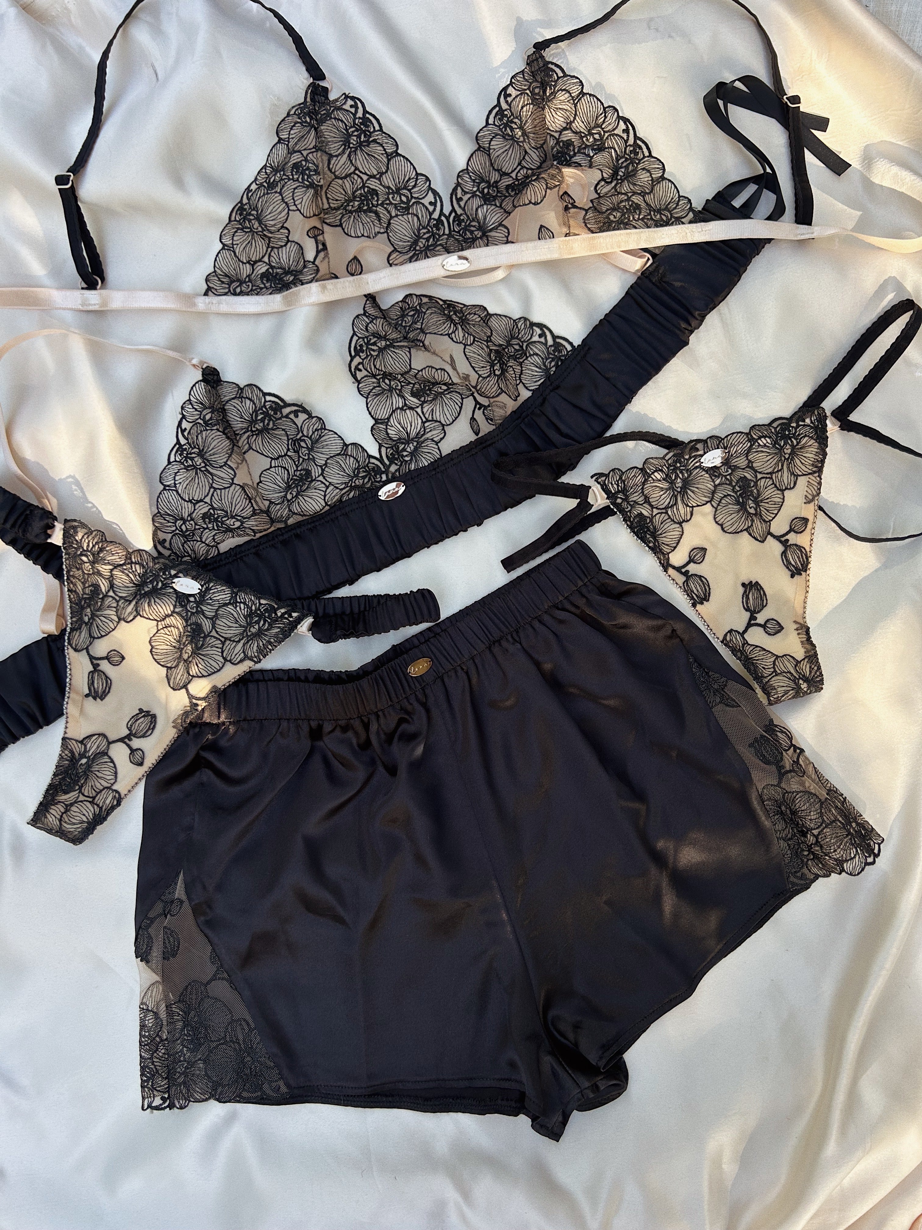 The Thalia Satin Shorties are a quiet ode to contrast, where satin meets lace. Crafted from fluid black satin, the silhouette is finished with delicate cut-outs adorned in cream orchid embroidery, mirroring the blooms of the Thalia bralette. Each detail feels intentional and romantic, made to move with you and whisper against the skin.