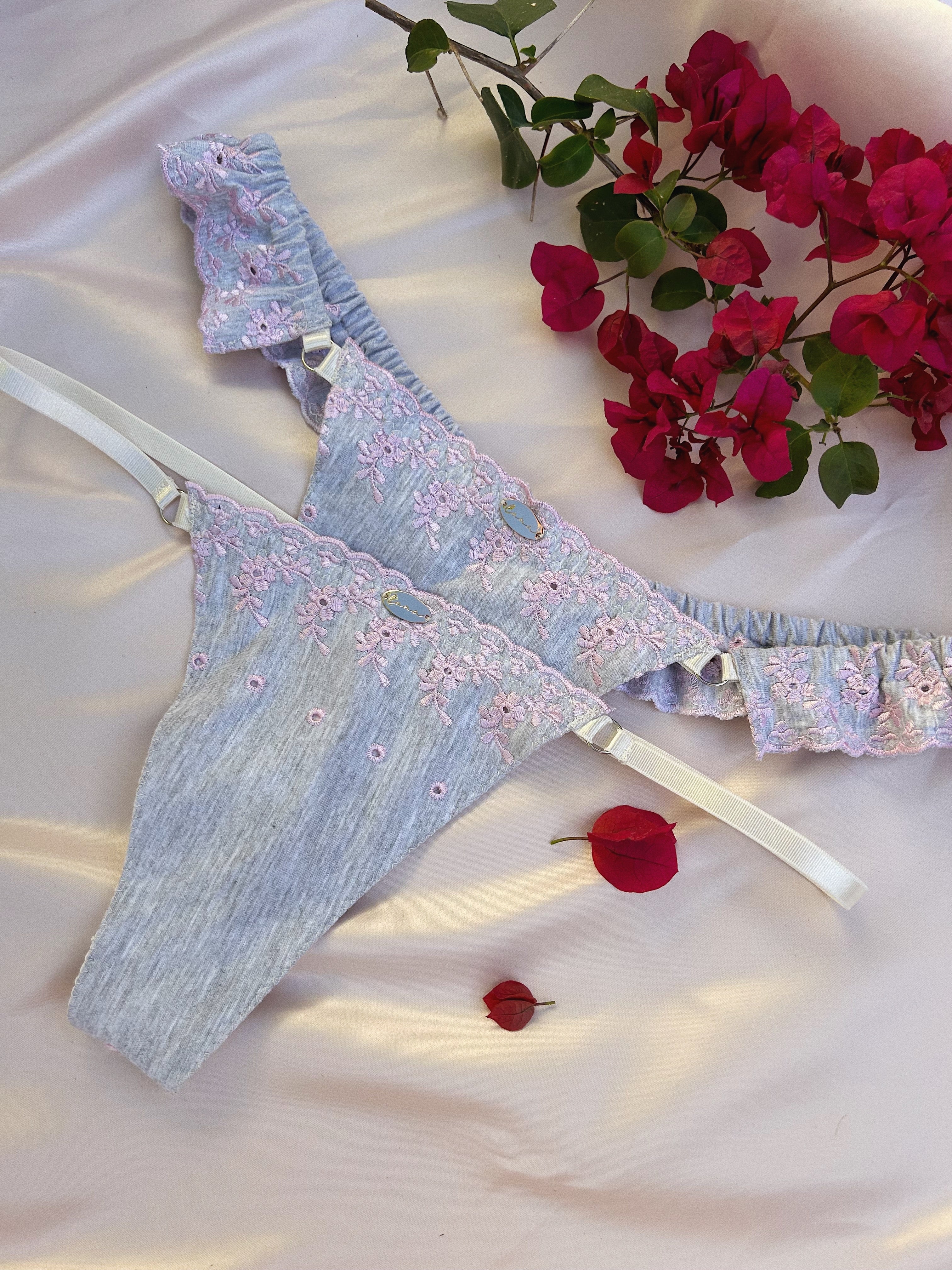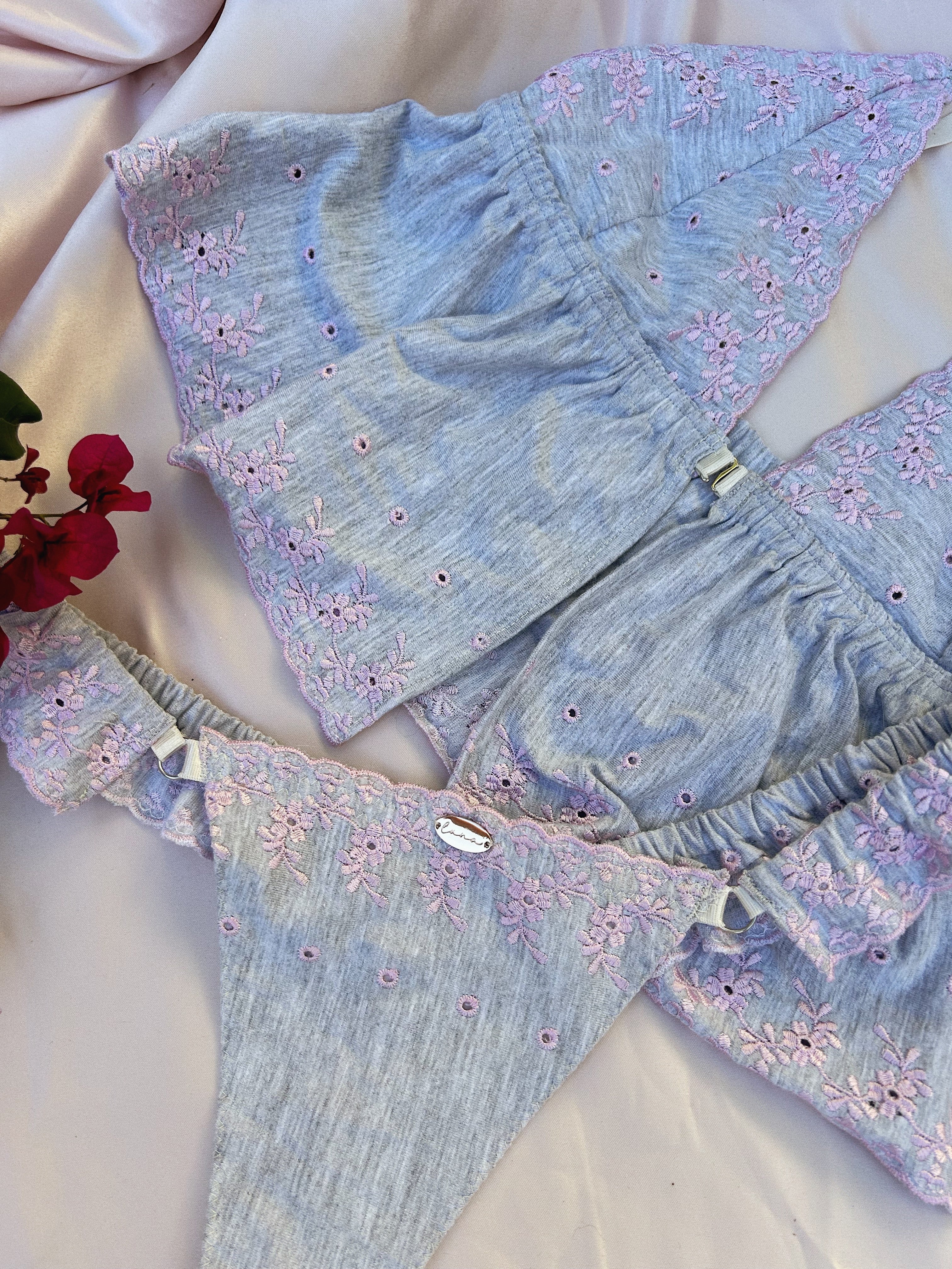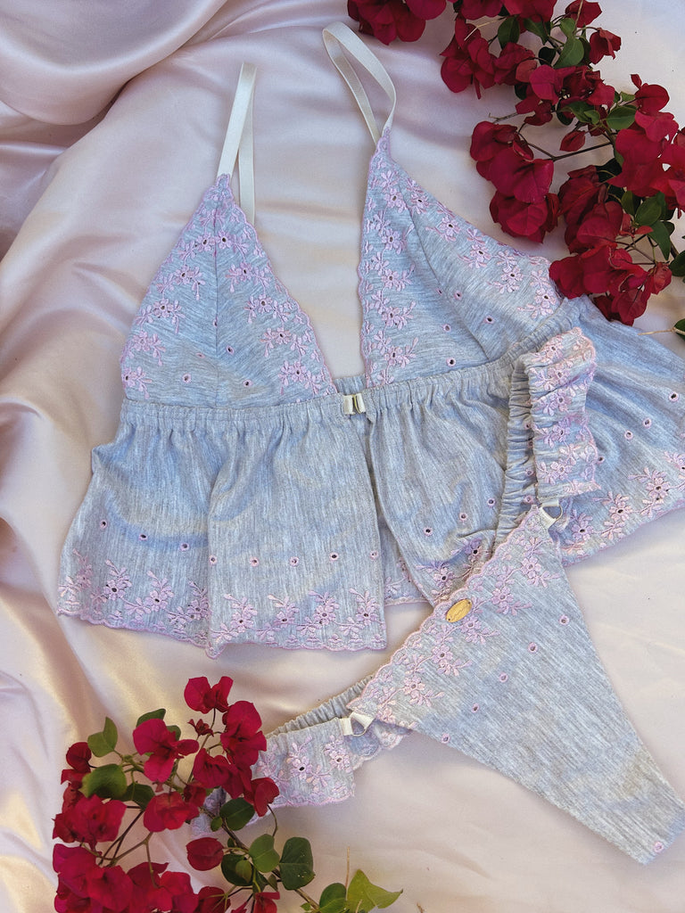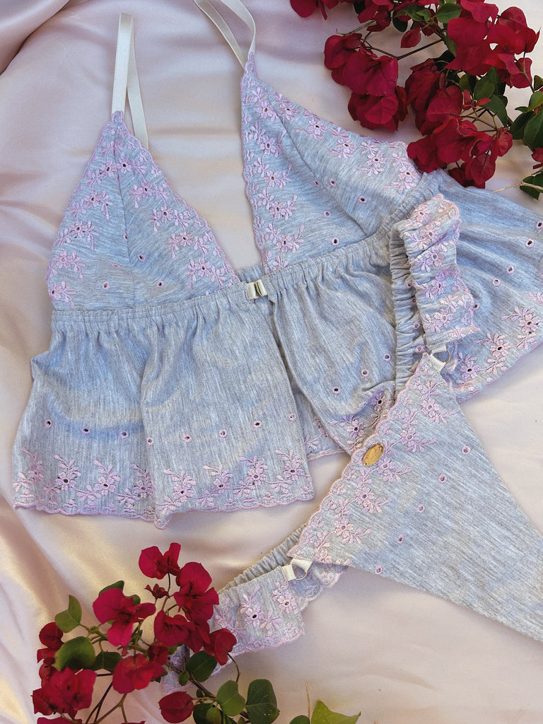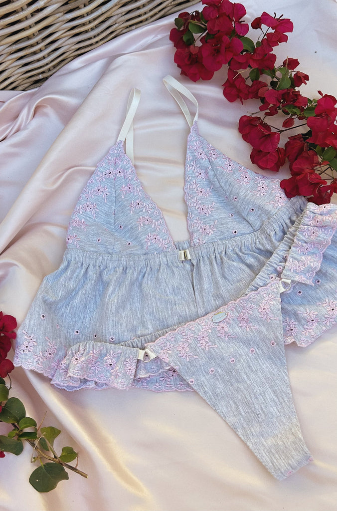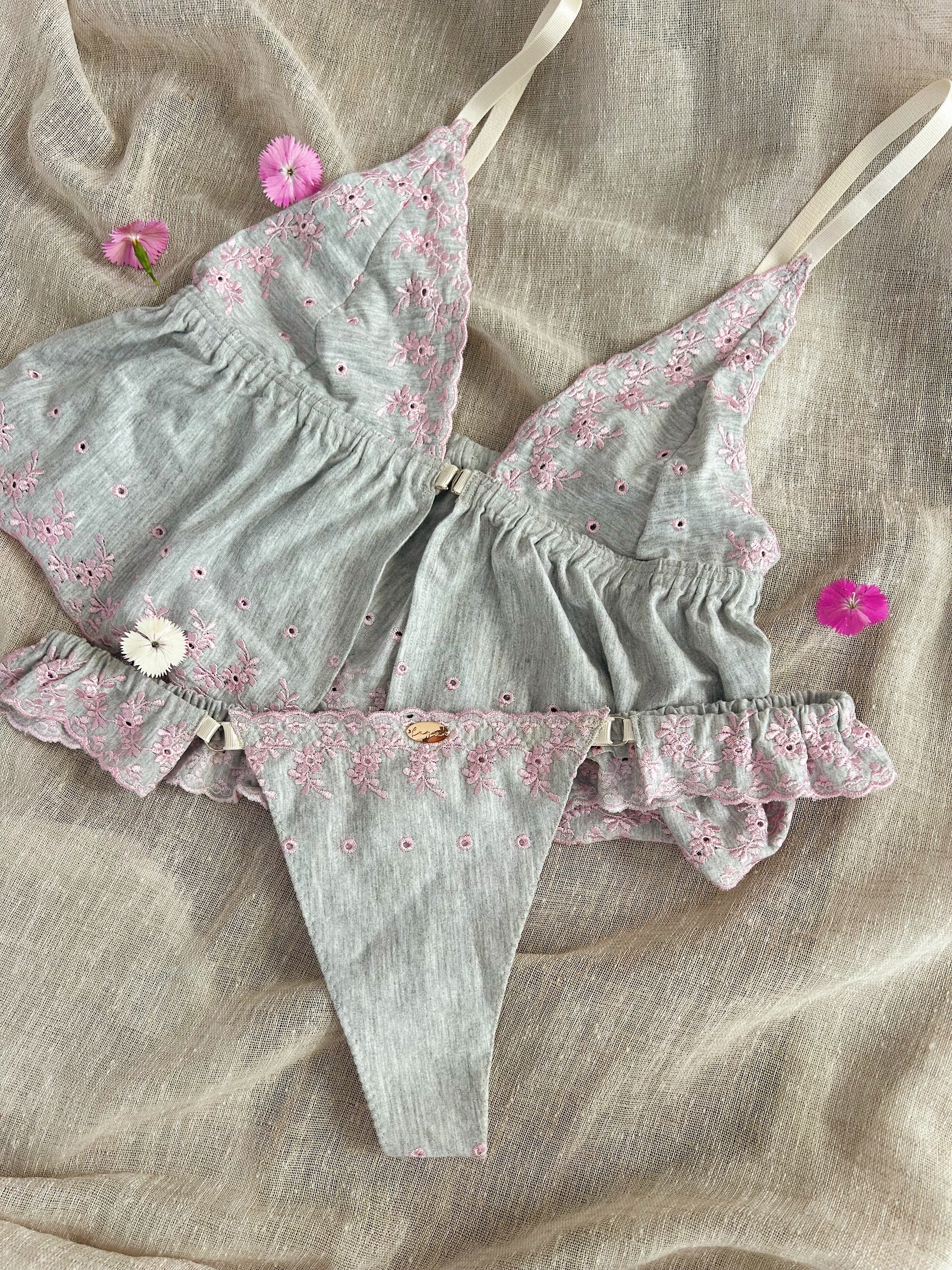 Meet our limited edition set, Anya. She enchants with her delicate soft cotton frills in a calm grey. Adorned with blush floral embroidery and complimented by elongated cups this set is bound for daydreaming and love stories.