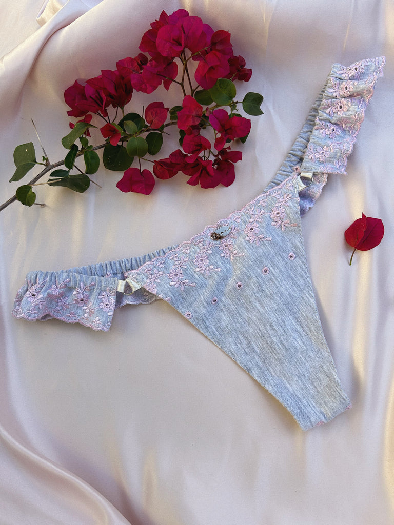 The bralette features a midline accent with subtle cotton frills; this dreamy detail is echoed in the design of the knickers. These are made in our classic thong style but with an extra touch of frill and magic.