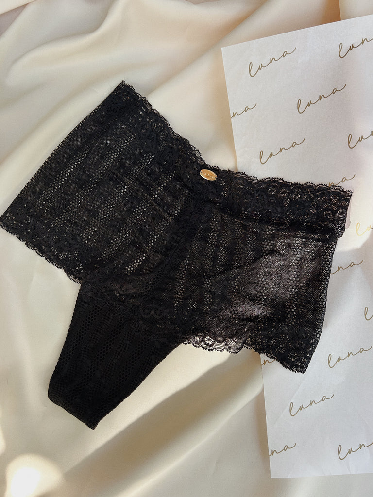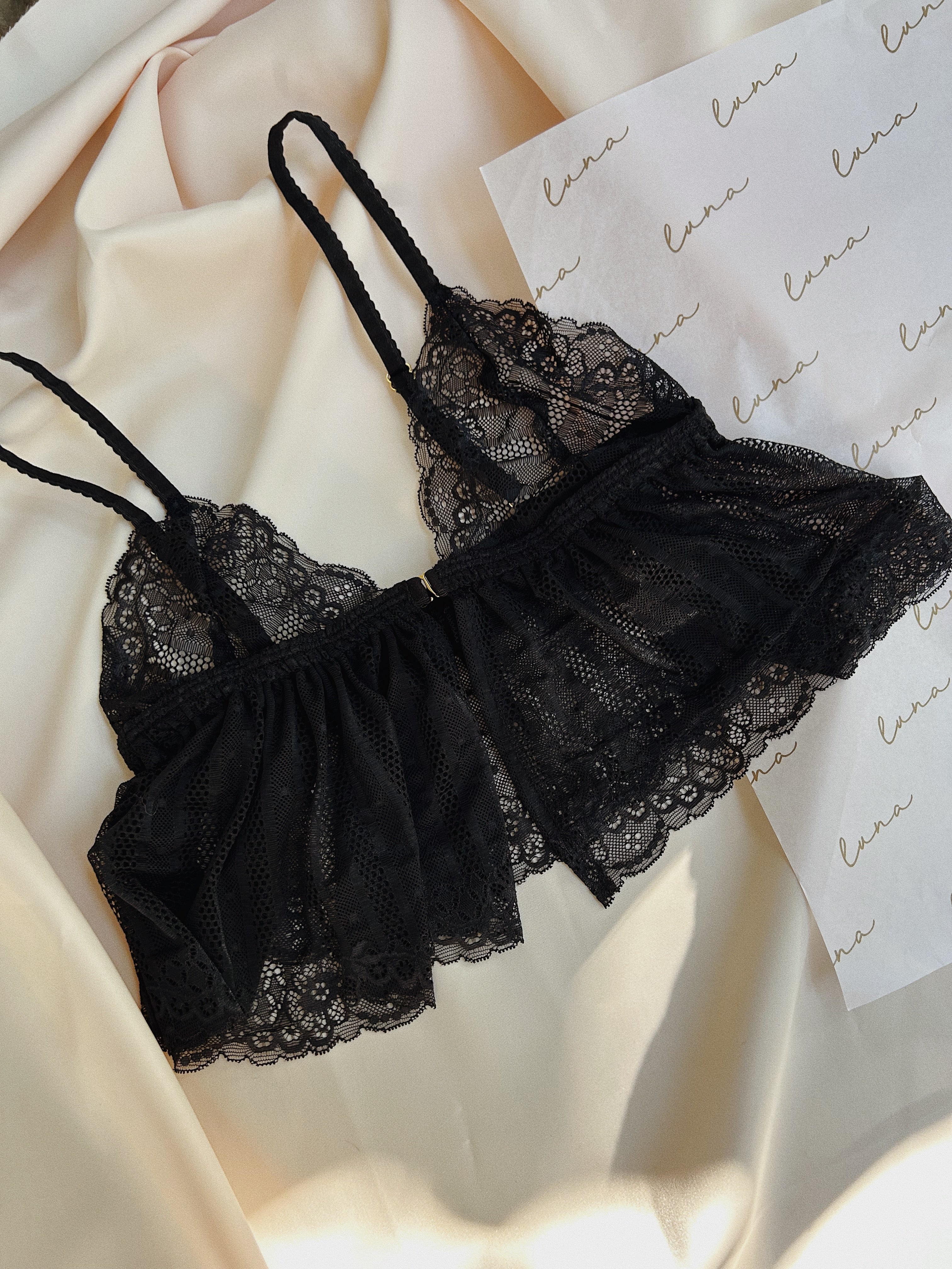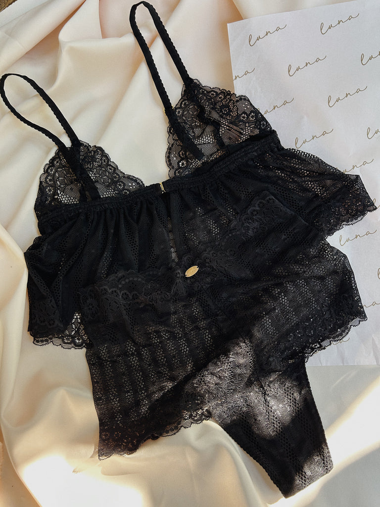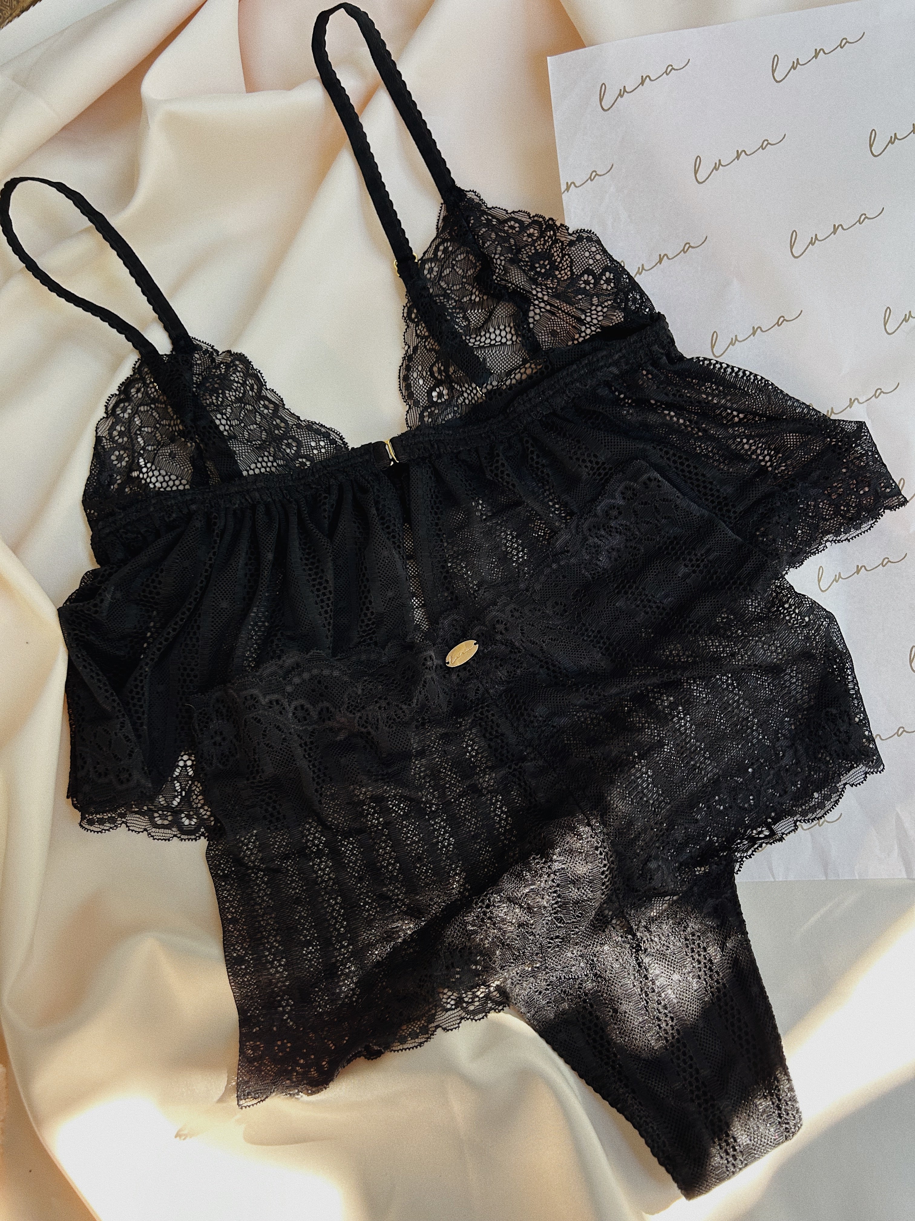Crafted from luxuriously soft striped black lace, this set balances structure and delicacy with effortless ease. The bralette features a flattering front clip detail, finished with warm gold hardware and a delicate longline lace frill that softly traces the band, adding gentle movement and romantic detail to the silhouette.