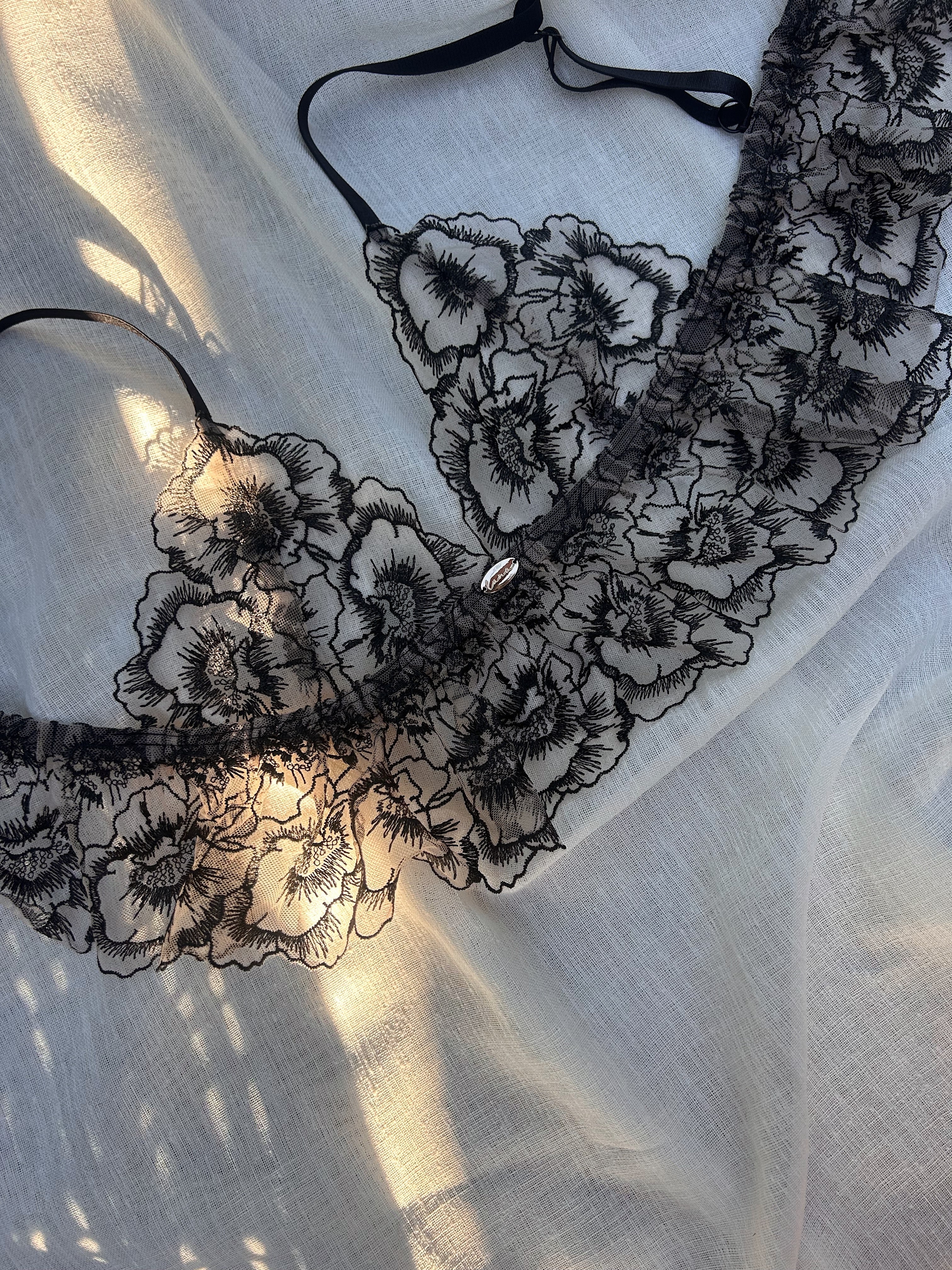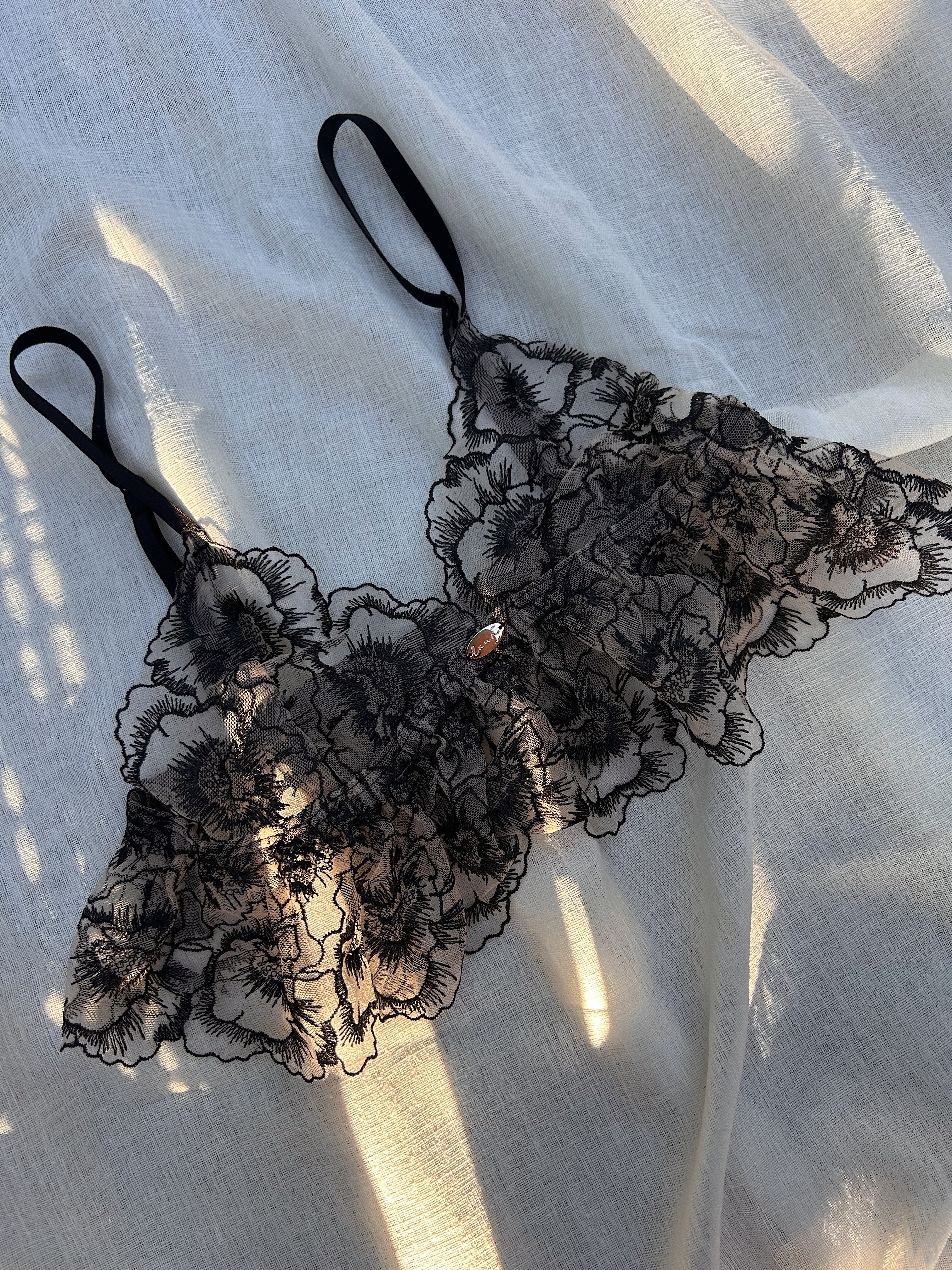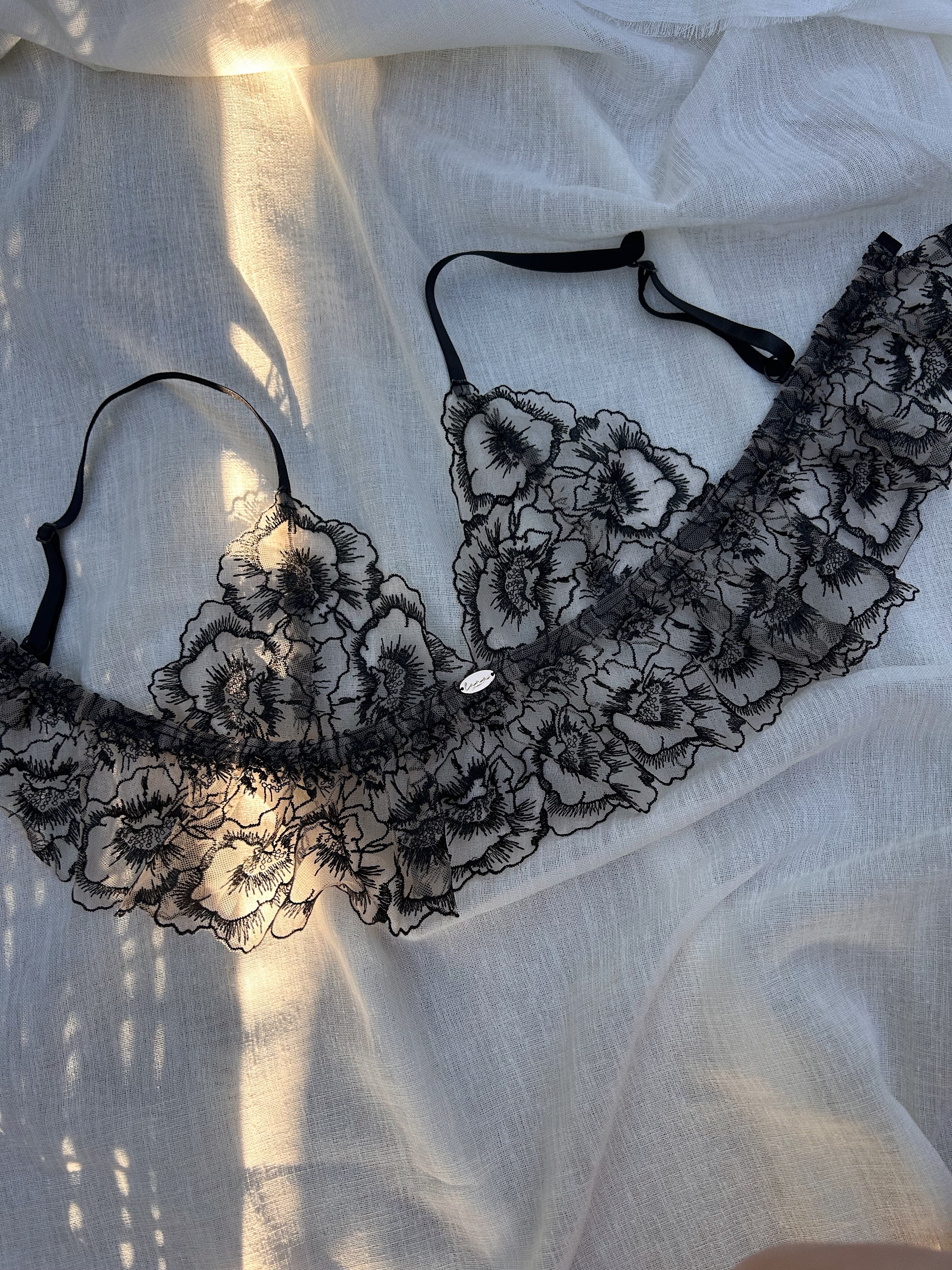 Sheer nude mesh blooms beneath inky black florals, creating a delicate play of light and shadow, a quiet nod to romance in its most intimate form. Designed for Luna’s mini Valentine’s collection, the Noirelle Bralette celebrates softness, and slow beauty.