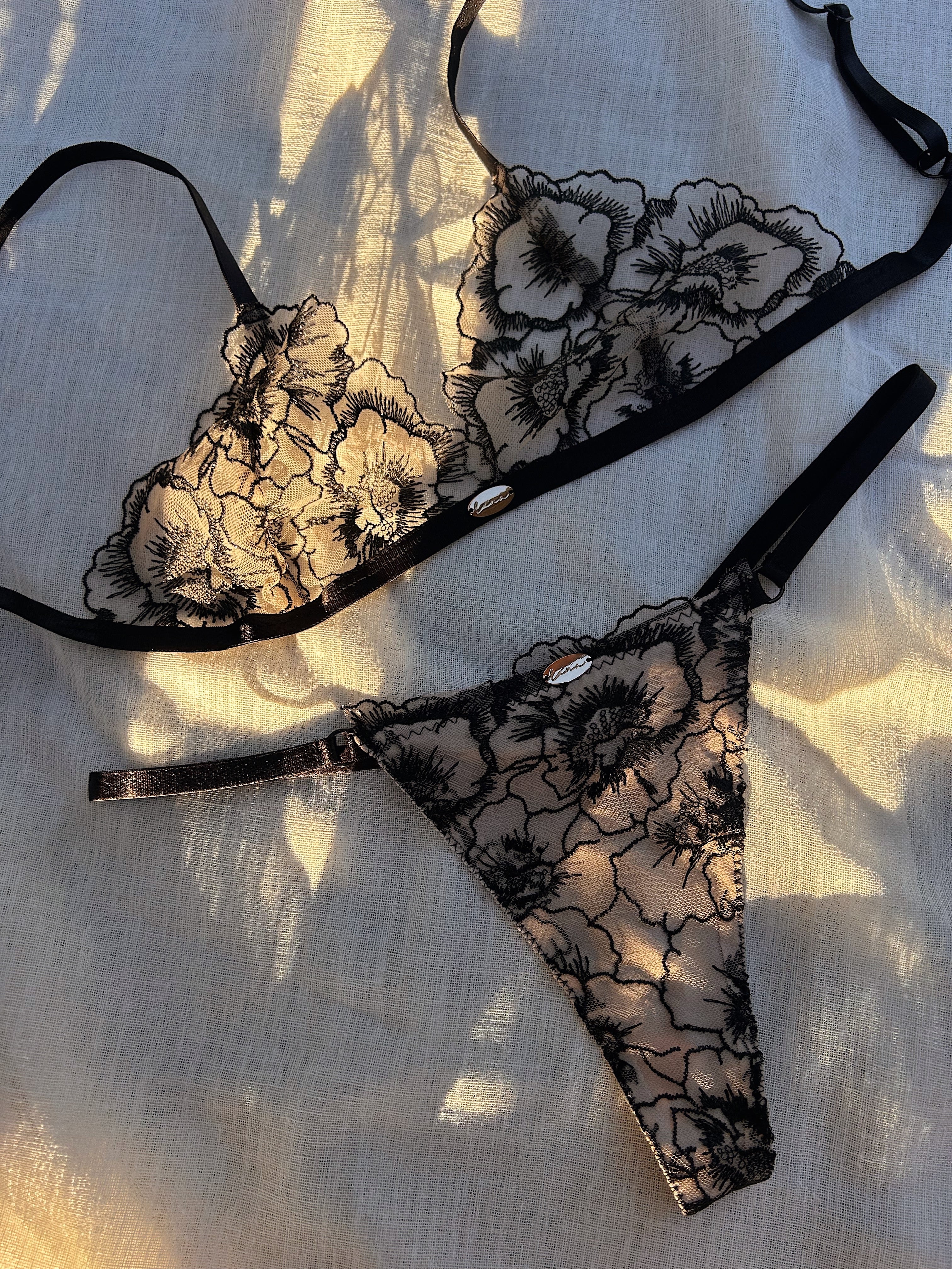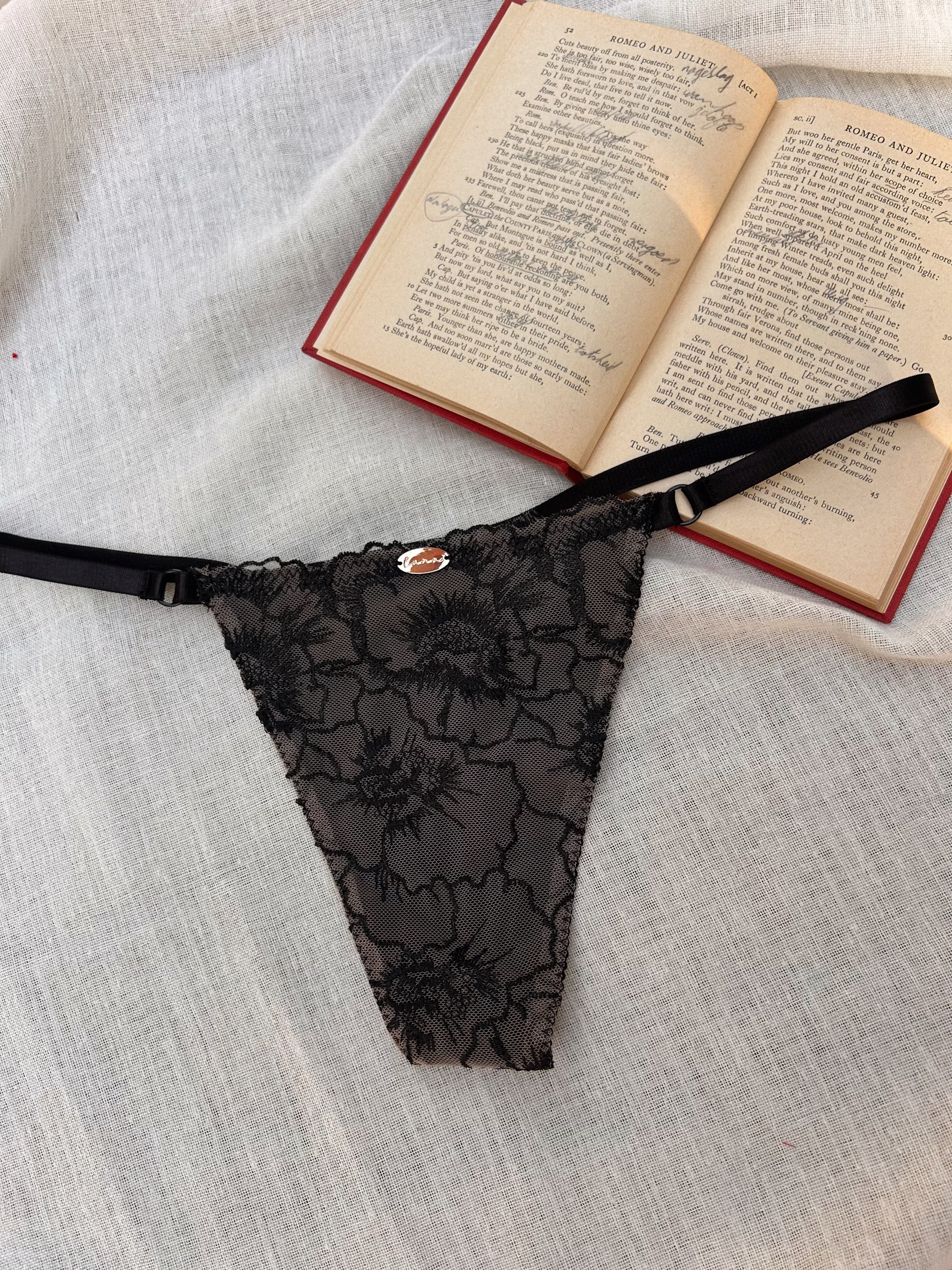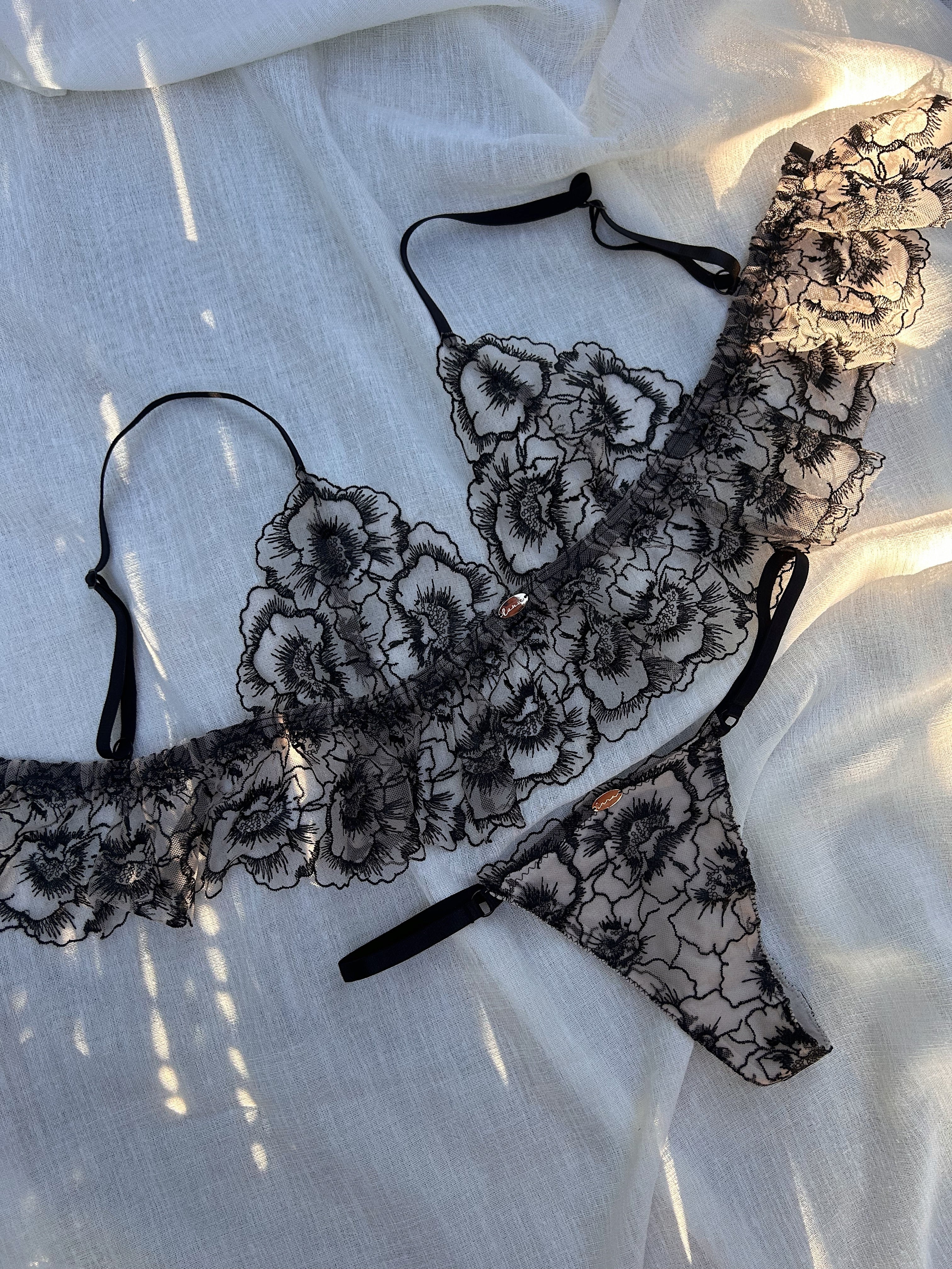 Layers of sheer nude mesh and inky black florals create depth and softness, allowing the delicate lace to become part of the form rather than sitting on top of it. The classic cut feels timeless and easy, making it a natural pairing with the Noirelle bralettes for both everyday moments or special occasions.