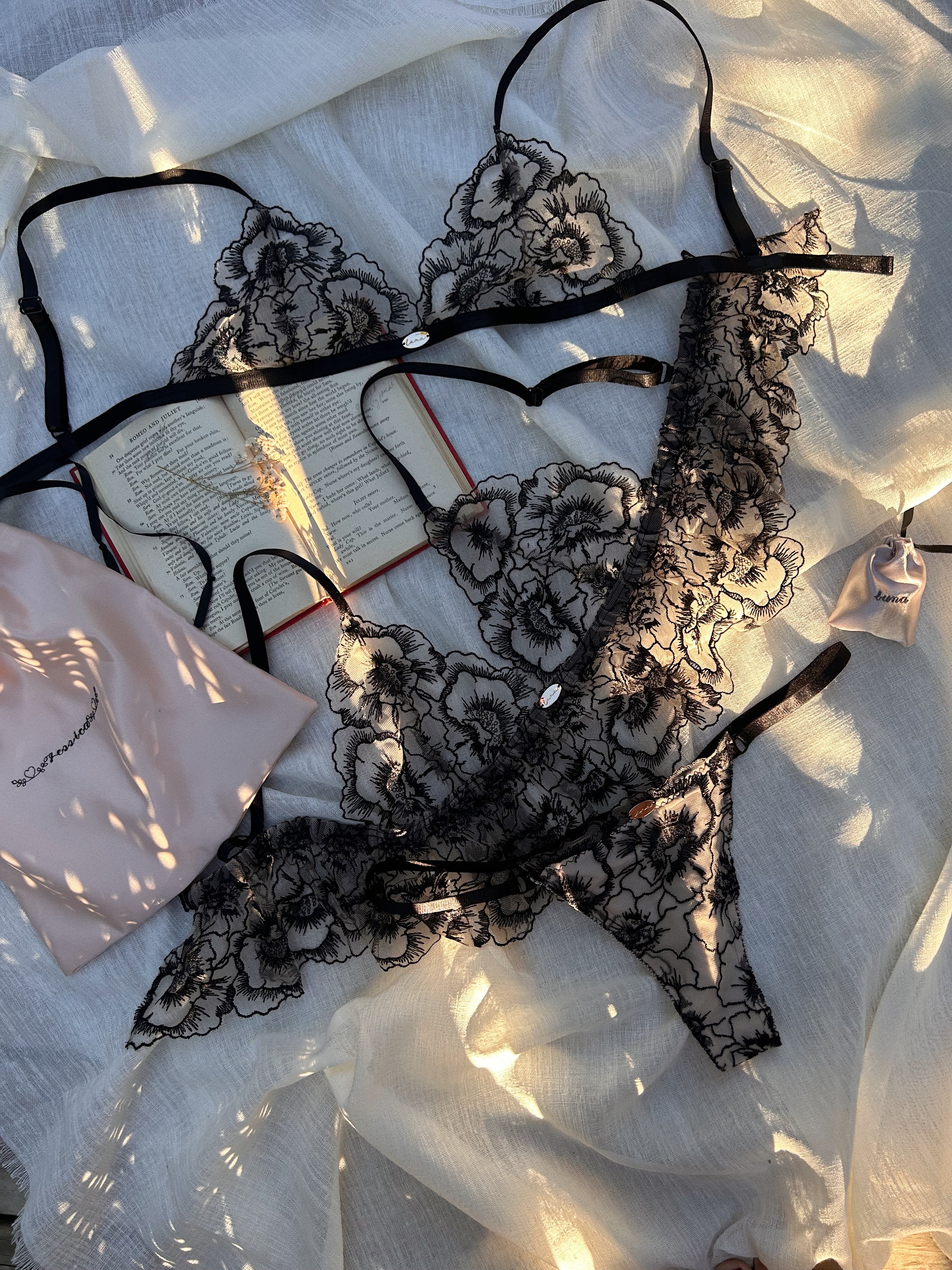 Our products are responsibly made by hand in our ethical studio in Cape Town. They have no price tags on them and come in a pretty box which is wrapped in our luxurious, locally sourced tissue paper. Each box also contains a hand embroidered delicately fragranced Luna sachet and a unique polaroid, making the opening of the box even more enticing!