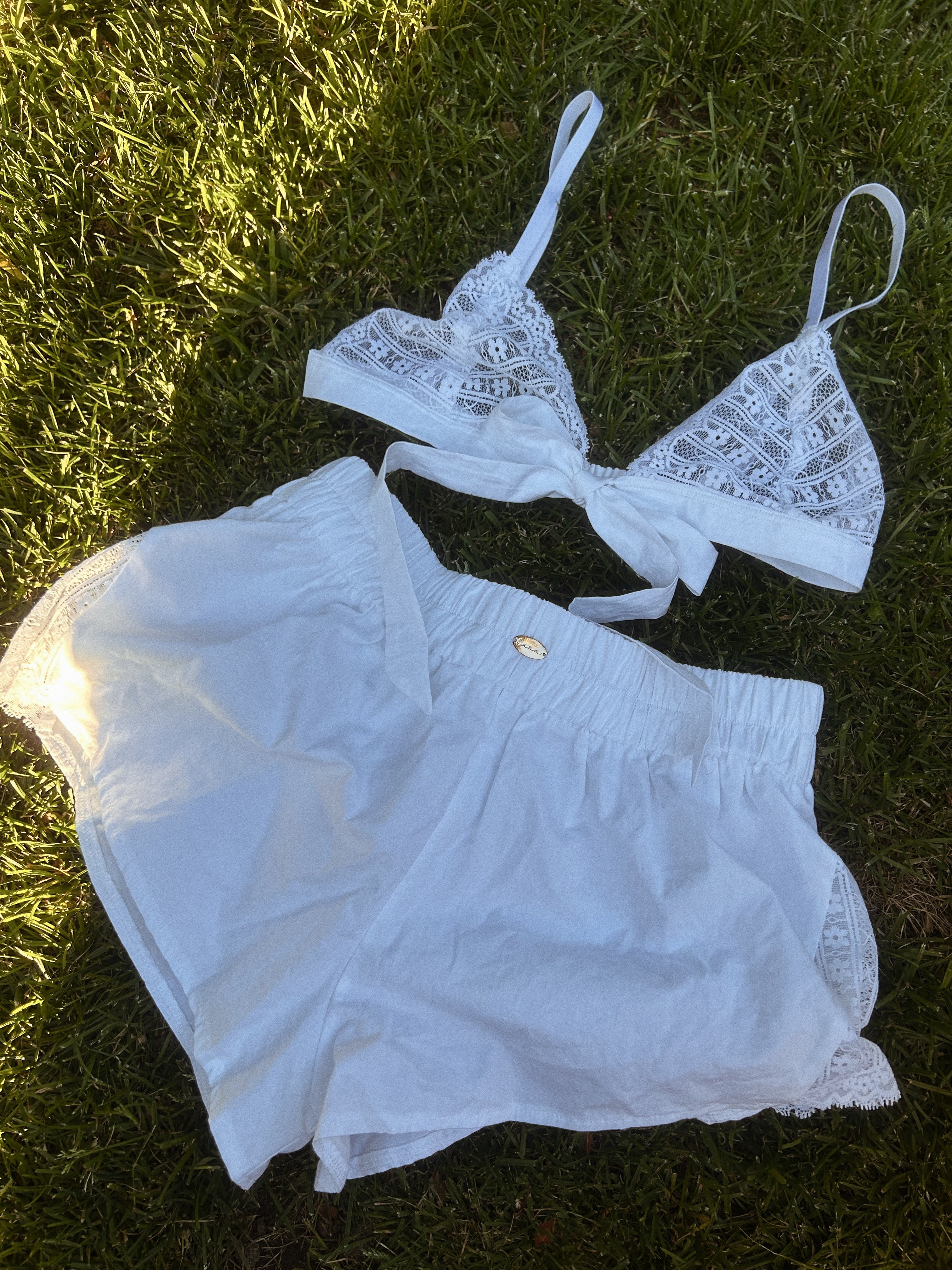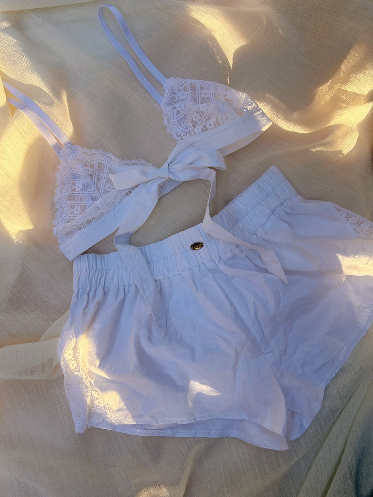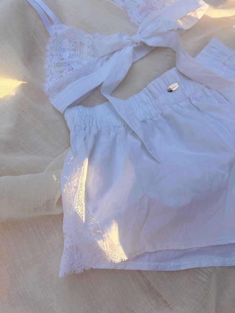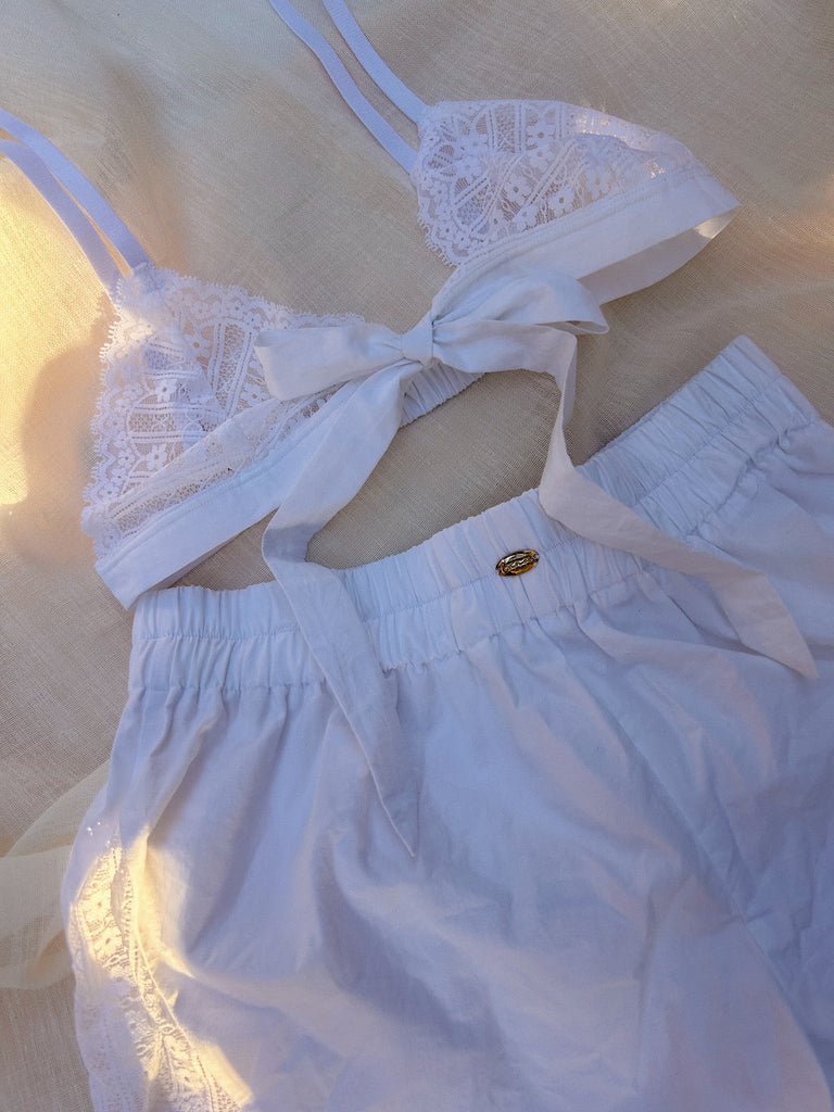 Soft, airy, and effortlessly feminine, the Althea Set combines everyday comfort with delicate detailing. The high-waist cotton shorts feature triangular white lace inserts on both sides, adding a subtle touch of romance to a classic silhouette. The matching bow bralette complements the shorts with soft white lace and a charming central bow, creating a flirty and dreamy look. Perfect for a bridal moment, the Althea Set is simple, sweet, and beautifully understated.