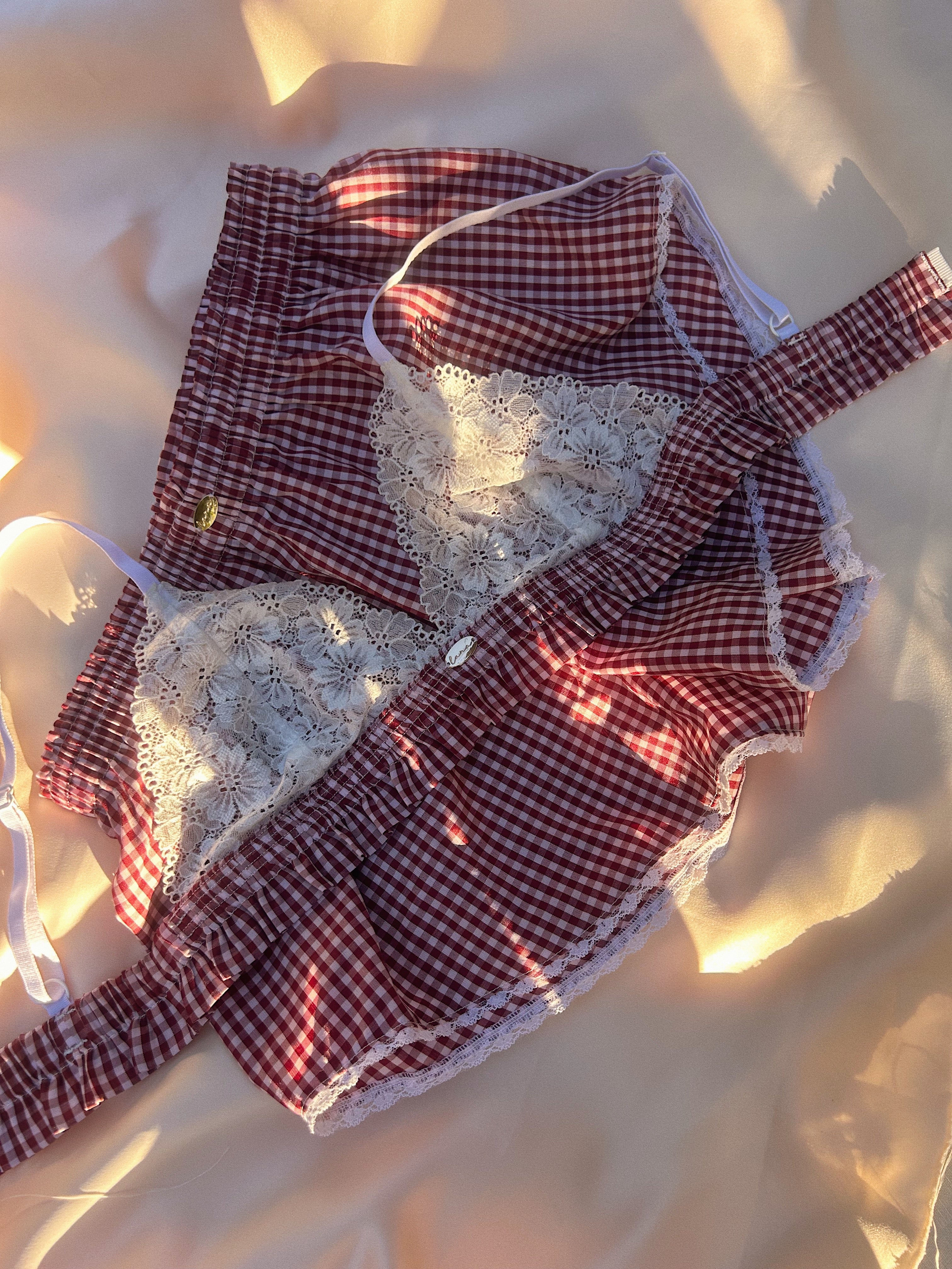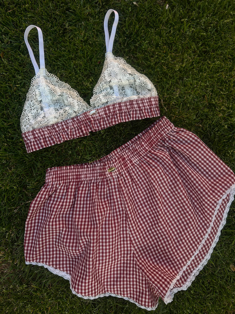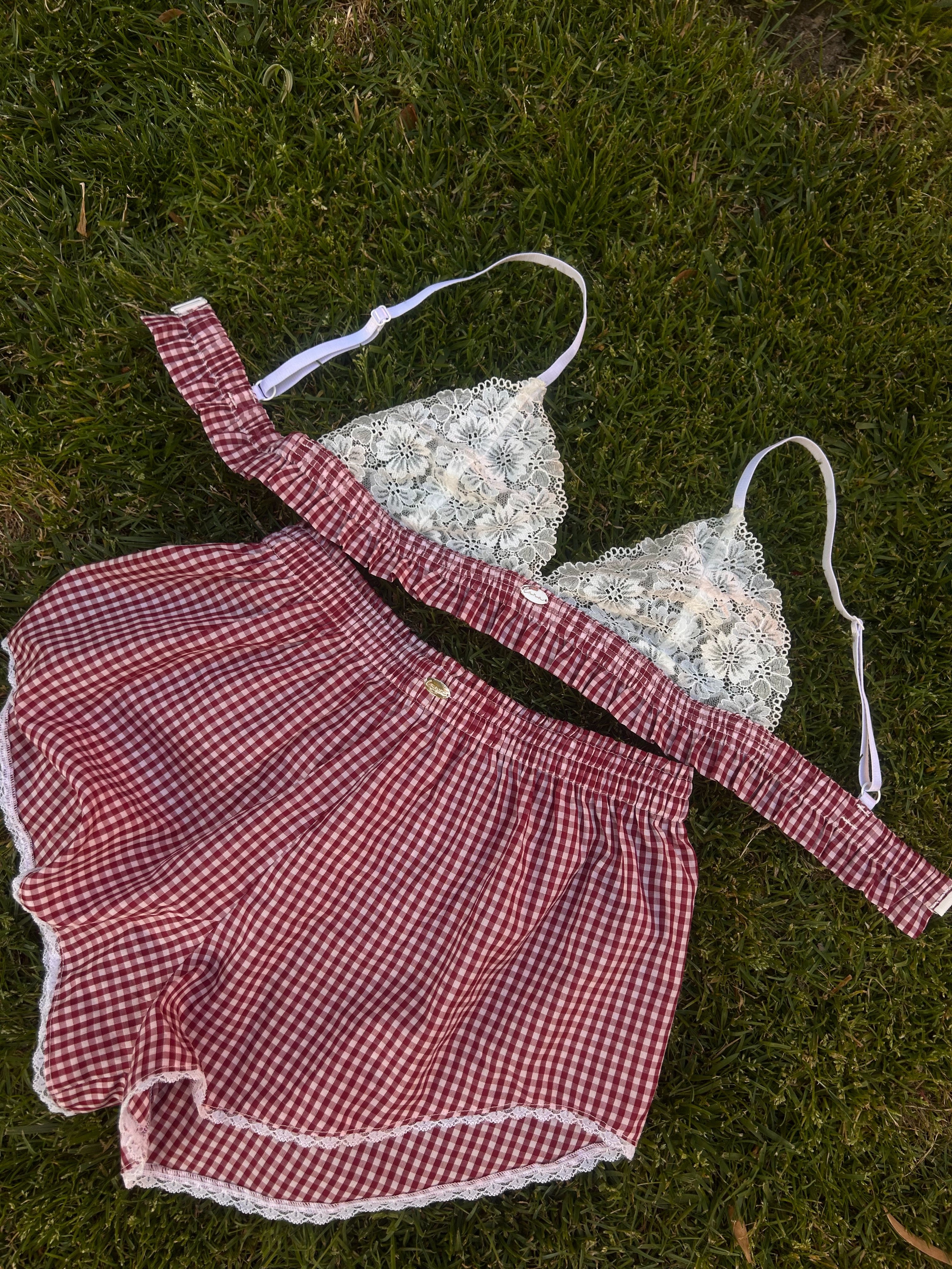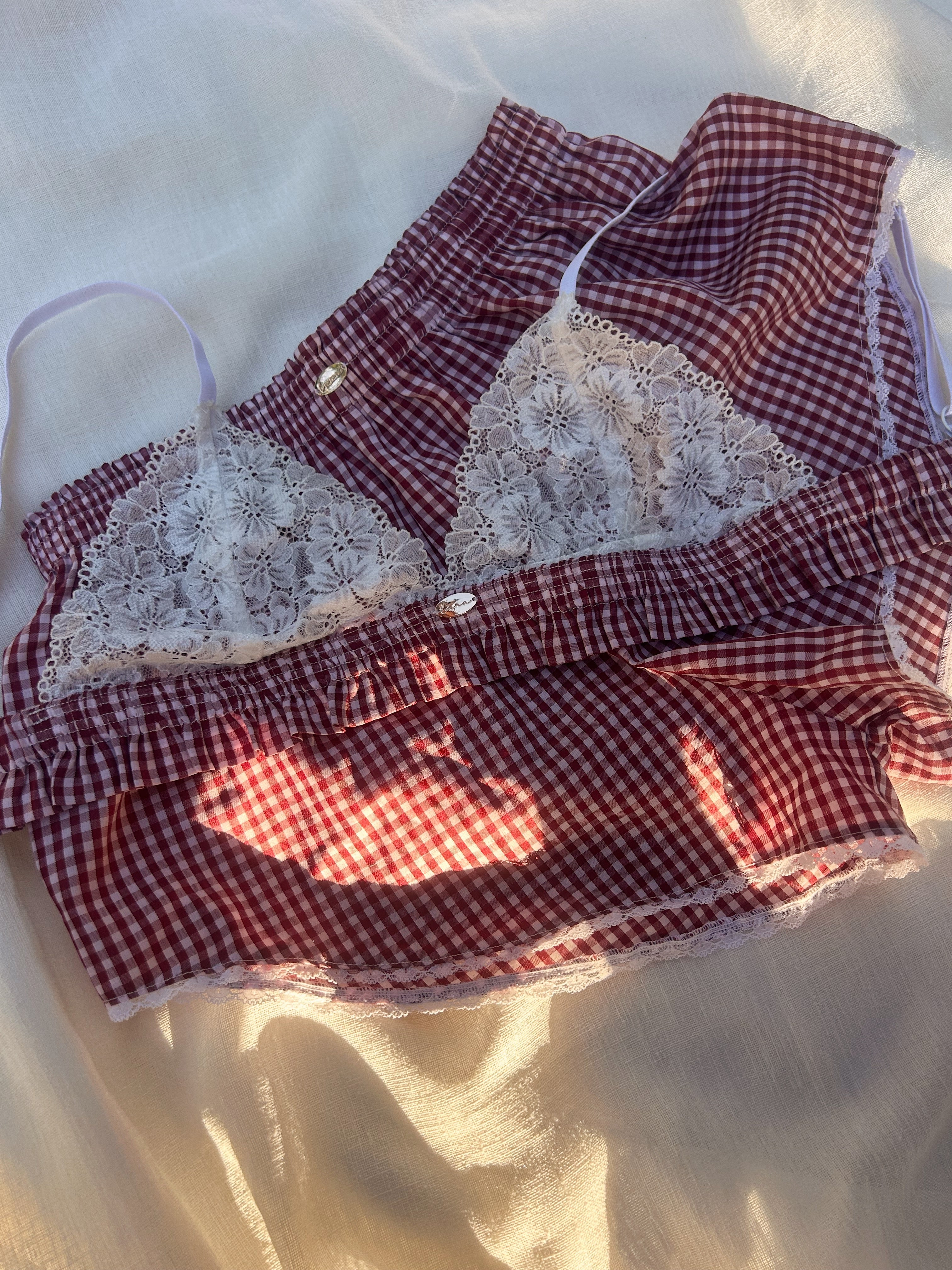 The bralette features delicate white floral lace cups, softened by a gentle gingham flourish band that adds a nostalgic, vintage touch. Paired with matching shorties, trimmed with delicate white trim, Poppy creates a silhouette that feels both sweet and softly sensual.